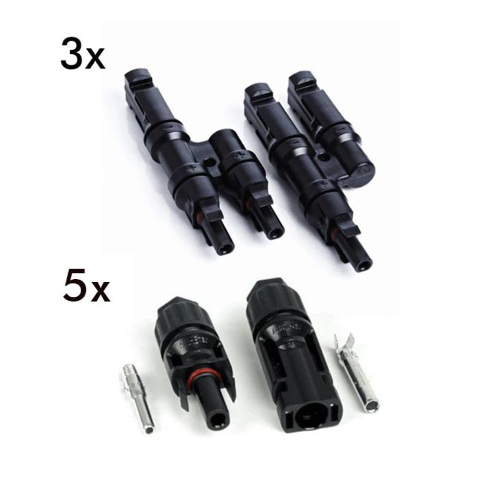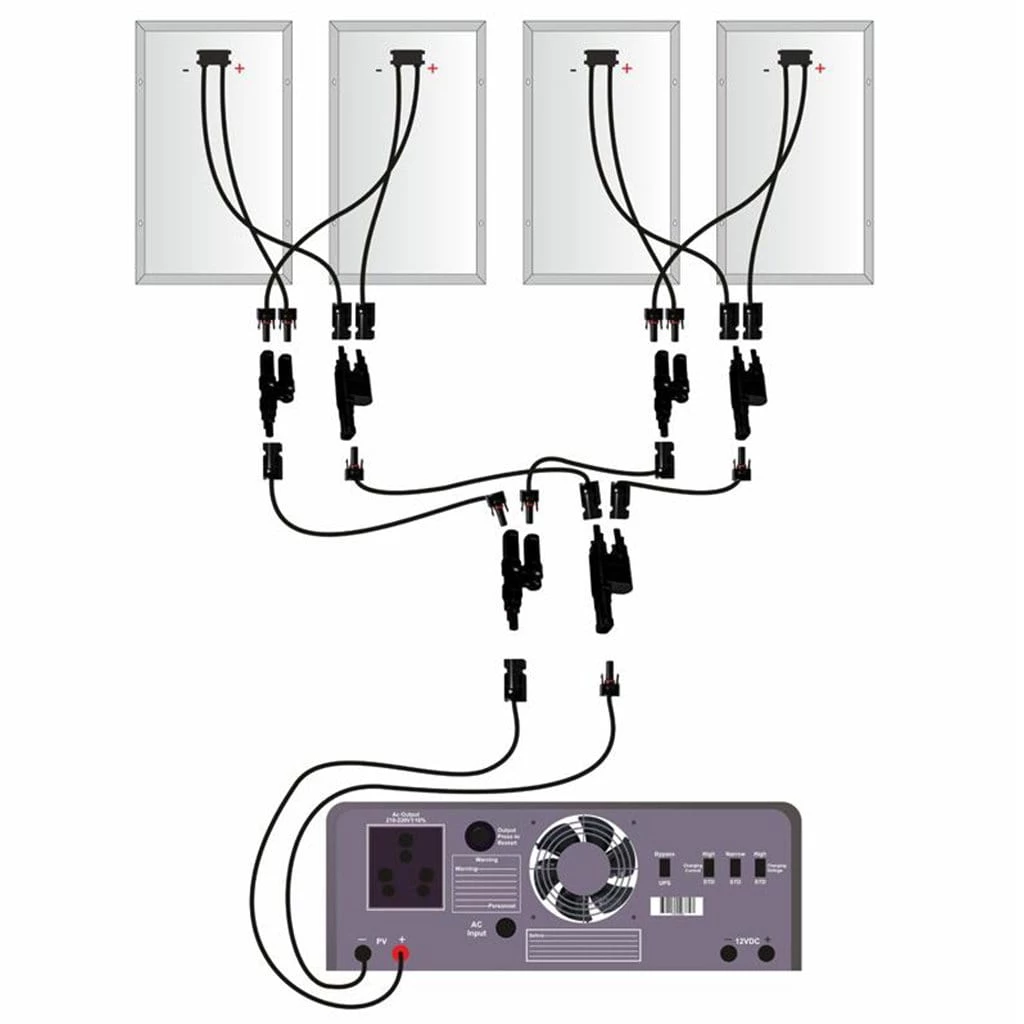 4 panel MC4 T-Type connector connects 4 solar panels from 10 watts to 400 watts. IP 67 rating makes it waterproof and dustproof for outdoor use.Â
